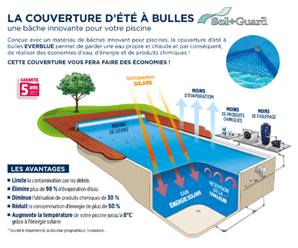 Conçue avec un matériau de bâches innovant pour piscines, la couverture d’été à bulles EVERBLUE permet de garder une eau propre et chaude et par conséquent, de réaliser des économies d’eau, d’énergie et de produits chimiques !